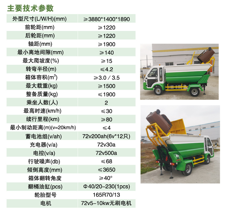 后翻桶式電動四輪清運(yùn)車,整車采用觀光車車頭,高強(qiáng)度游艇玻璃鋼材質(zhì),整體成型,線條流暢,堅(jiān)固耐腐蝕,新穎美觀;車廂全封閉不銹鋼箱體,防銹力強(qiáng)。廣泛應(yīng)用于中心城區(qū)、居民小區(qū)、酒店、食堂、醫(yī)院等各類桶裝垃圾的收集轉(zhuǎn)運(yùn)。