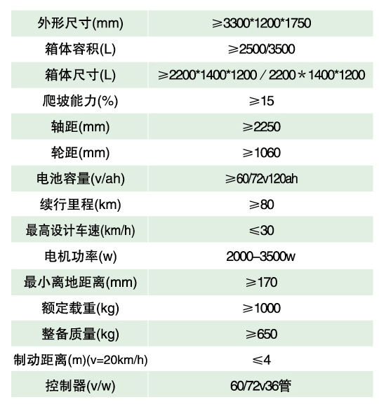 本產(chǎn)品采用超大容量2500/3500/4200L箱體(鐵/不銹鋼可根據(jù)客戶要求定做),箱體采用全密封結(jié)構(gòu),車箱體科學設計,兩側(cè)均設計上、下開門式,尾門設計向左側(cè)270度單側(cè)打開,垃圾箱底板采用加厚鋼板三邊5公分折邊加固滿焊而成,尾部呈拋物線向上崛起20 度,有效防止液體垃圾在回收過程中產(chǎn)生二次污染,箱體設計巧妙合理,左、右、后側(cè)三面均可輕松上卸垃圾。整車采用一體式軸傳動雙驅(qū)后橋,前后均采用加重型超耐磨耐載重品牌輪胎。大功率2000-3500w品牌電機,爬坡更強勁,滿載行駛更輕松更省力。整車配置60/72v120ah大容量可維護鉛酸品牌蓄電池,續(xù)行里程滿載/空載80100km。垃圾箱采用獨特的工程液壓自卸系統(tǒng)結(jié)構(gòu),環(huán)衛(wèi)工人在操作裝卸翻倒垃圾時,更加省力、省心、省時。(注:此車可配裝加重型半封閉式或全封閉式車棚 )